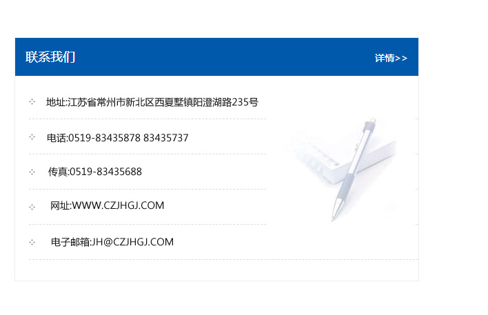 傳真:0519-83435688    郵編:213135    網(wǎng)址:WWW.czjhgj_com.zq-comatsu.com    電子郵箱:JH@czjhgj_com.zq-comatsu.com